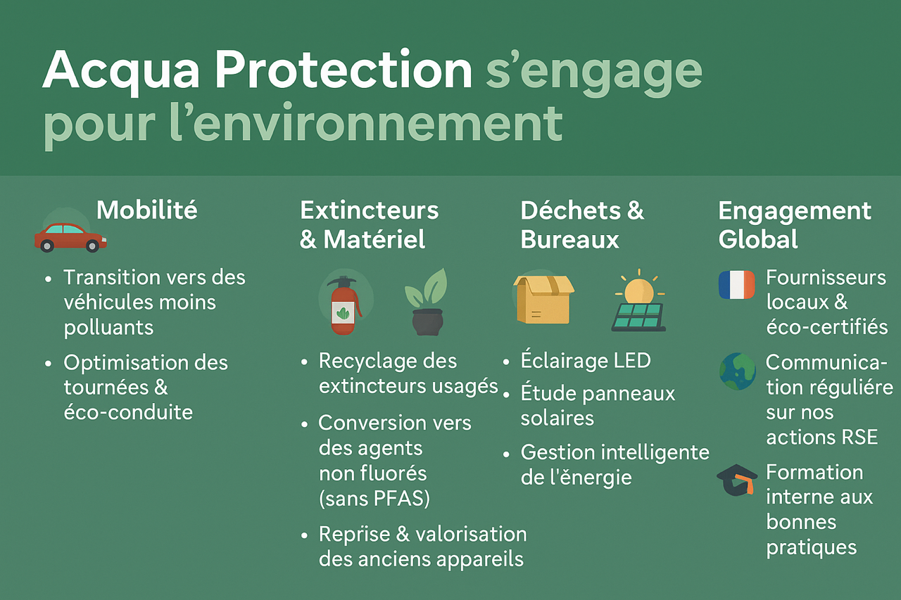 Acqua Protection s’inscrit dans une démarche responsable pour réduire son impact environnemental tout en garantissant un haut niveau de sécurité incendie. Plusieurs actions concrètes peuvent être mises en place ou valorisées afin de montrer à nos clients et partenaires que la protection de l’environnement fait partie de nos priorités.