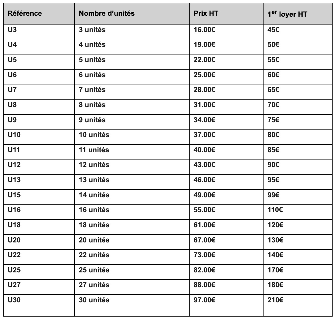 Le pack initial comprend 3 unités au choix (30 max.) dans notre catalogue spécialisé LEASING.