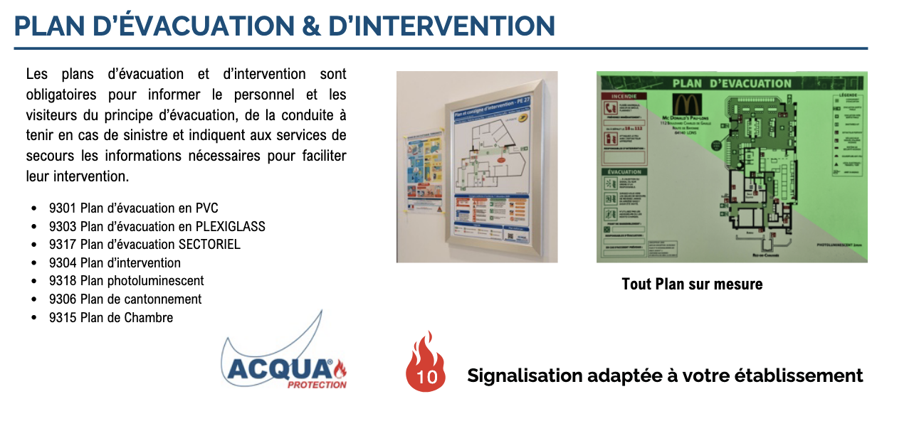 En plus des indications sur les équipements, la signalétique inclut des consignes d’évacuation, des plans d’intervention, ainsi que des rappels de sécurité, comme l’interdiction d’utiliser les ascenseurs ou la nécessité de maintenir les issues dégagées.