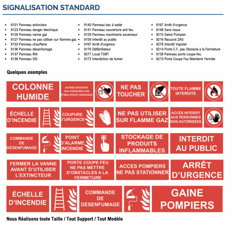 La signalétique incendie est essentielle pour garantir une identification rapide des équipements de sécurité et des itinéraires d’évacuation en cas d’urgence. Elle se compose de panneaux, d’autocollants ou de plaques indiquant clairement la présence d’extincteurs, de robinets d’incendie armés (RIA), de colonnes sèches ou humides, et d’autres dispositifs de lutte contre le feu.